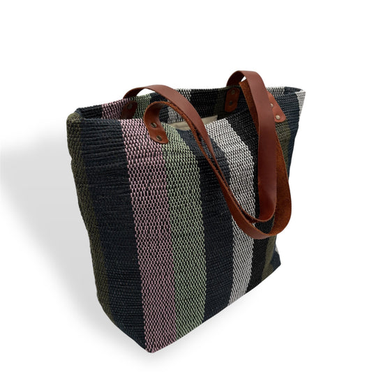 Sac fourre-tout recyclé avec lanières en cuir - Rayures noires, pistaches et rosesPrix habituel $72.00 USDPrix habituelPrix unitaire par-