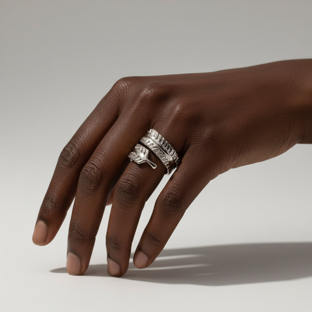 Beautiful handmade brass ring with a leaf design. Plated with chrome to give a silvery color. Created by artisans in Old Cairo, Egypt.